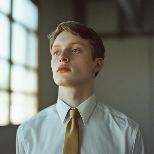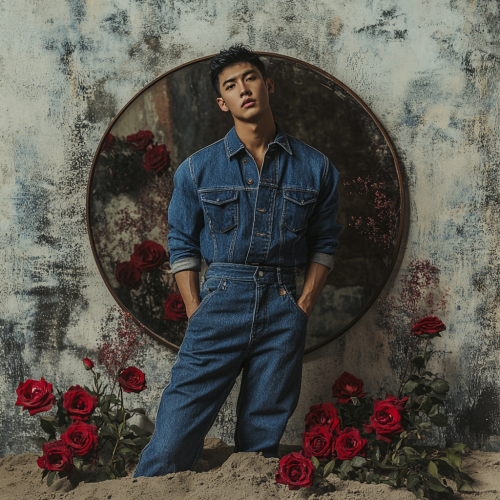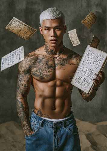 a young filipino man with white blonde bleached hair, with tattoos on his body, and the design of the tattoos extending to the space around him and also to the mirror in front of him. he has words falling from a notebook and the letters are falling on to the sandy floor. in denim outfit, concrete abstract studio background with a retro high school yearbook lighting feel standing on sand, abstract surreal photography . vogue editorial layout pose with david lachapelle influence. --ar 5:7