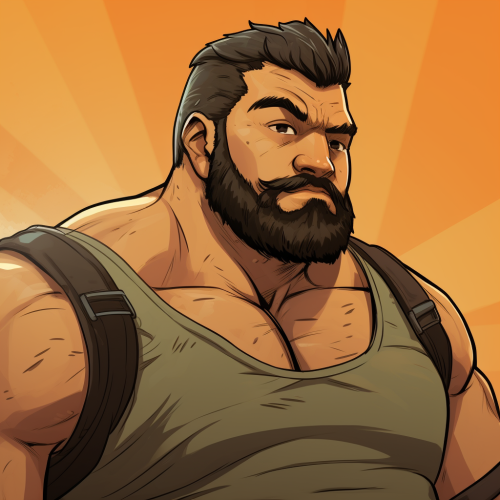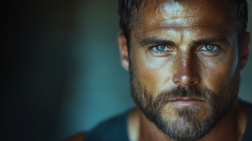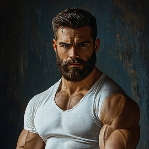 Create an intense, close-up portrait of a muscular man with a focused expression, looking determined. He has short, dark hair and a well-groomed beard, wearing a dark, sleeveless athletic shirt that reveals his toned arms. The lighting should highlight his facial features and muscular build, creating shadows that add depth and emphasize his physique. Use a blurred background to make him the central focus, with moody, dramatic lighting to convey strength and confidence. Set the background in a neutral or dark tone to enhance the intensity of his expression and form. --ar 16:9 --iw 3 --s 1000