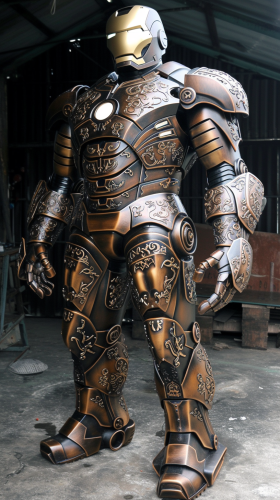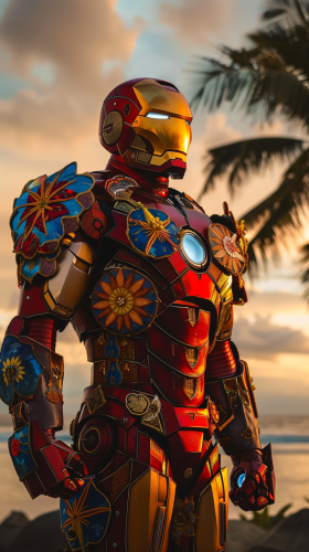 a Filipino-inspired Iron Man, featuring a vibrant color scheme of red, blue, and yellow, reflecting the Philippine flag. The armor is adorned with traditional elements such as intricate patterns inspired by Barong Tagalog and colorful tribal designs, incorporating textures reminiscent of woven fabrics. His helmet has a subtle shape that echoes the headgear of Filipino warriors, with accents resembling a sun and stars from the national flag. In the background, he stands against a tropical landscape with palm trees and a sunset over a beach, showcasing iconic landmarks like the Mayon Volcano or the Banaue Rice Terraces, evoking a sense of cultural pride and natural beauty. Bold colors. Photography. Taken on Pentax67II --style raw --ar 9:16 --v 6.0