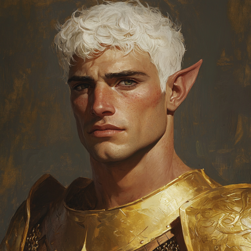 Portrait of ruggedly handsome, Hyper muscular half orc with two vastly different color eyes, short curly white hair, defined muscles, pronounced features, hyper muscular, wide Grecian nose, strong square jaw, defined cheek bones, masculine features, freckles, wearing golden high elf armor, realistic