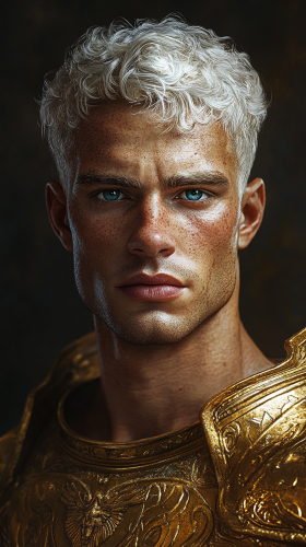 Portrait of ruggedly handsome, Hyper muscular half orc, bright blue eyes with gold, short curly white hair, defined muscles, pronounced features, hyper muscular, different color eyes, wide Grecian nose, strong square jaw, defined cheek bones, masculine features, freckles, wearing golden high elf armor, realistic. Realistic. --ar 9:16
