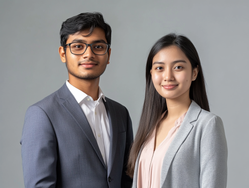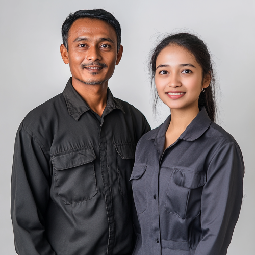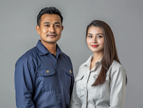 Professional studio portrait of a Bangladeshi man and an Asian woman, aged 20 to 30, both representing skilled work force. The man is wearing industrial work clothes, with a soft, calm smile. His posture is confident and humble, highlighting his hardworking nature. The woman standing next to him, also wearing house cleaning work clothes, has a gentle, calm expression. The lighting is soft and even, emphasizing their facial features and the natural texture of their clothing. The background is neutral, keeping the focus on the subjects. Their calm, welcoming demeanor exudes a sense of professionalism and dedication.