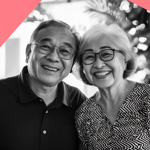 black and white photo of smiling filipino good looking senior couple with black and white graphic design in the background and a little bit of neon pink