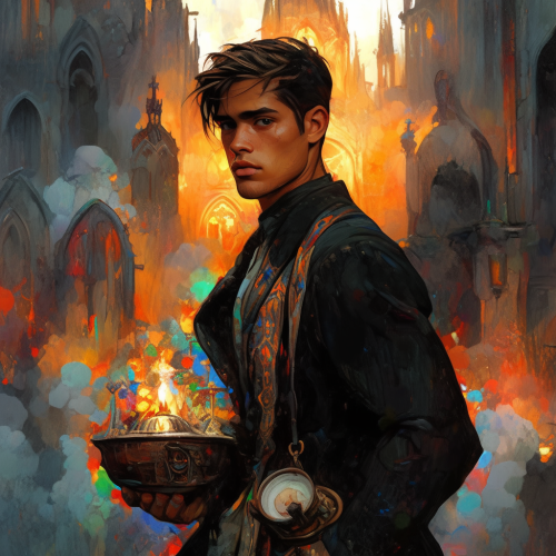 close-up, male filipino pinoy priest walking past a gothic cathedral, holding a smoldering censer, tense action thriller, inspired by kj apa tom daley adam rippon, colored inks style, style of luis royo, leonid afremov, mike zeck, edgard maxence, mondrian --niji 5