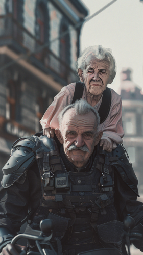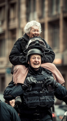 a photographic composition of a special police officier carrying a very old lady on his shoulders in the streets. The police officer has a full black strapped uniform with a helmet, and a very serious expression. The grandma has a pink dress. She is lauging loud. We see them from the 3/4 side. raw style --ar 9:16 --v 6.0
