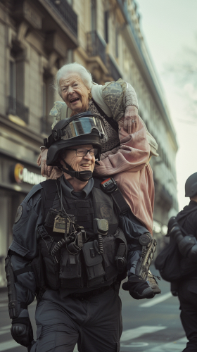 a photographic composition of a very serious special police officier carrying a very old lady on his shoulders in the streets. The police officer has a full black strapped uniform with a helmet, and a very serious, almost angry facial expression. The old woman has a pink dress. The old woman is laughing loud. We see them from the 3/4 side. raw style --ar 9:16 --v 6.0