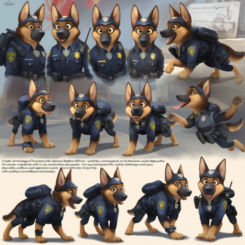"Create a vibrant image of Chase, the German Shepherd police officer from the Dog Patrol. He should be in a command pose, with his bright dark blue uniform and gold accents. Your eyes should be large and expressive, showing confidence and leadership, with a friendly smile. Include the golden badge in your hat and your backpack full of police gadgets. Use soft shadows to give depth, with a simple background that highlights the character." --niji 6 --style raw --s 750