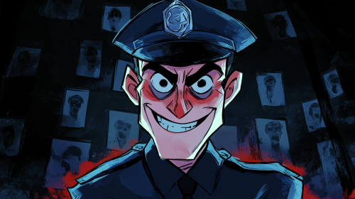 Create a haunting cartoon-style image of a police officer, Agent Crane, standing in a dimly lit room filled with framed photos of grateful families and closed case files. His expression should be one of triumphant arrogance, with a mocking smirk that reveals his true nature. In the background, show shadows of victims looming, representing the terror he instills. Use a dark color palette dominated by deep blues and reds, enhancing the eerie atmosphere. Include subtle elements like a reflection in a glass surface that hints at a monstrous version of himself, emphasizing the contrast between his public persona and his hidden malevolence. The overall image should evoke a sense of dread and confusion about the true nature of the man they trust. --ar 16:9