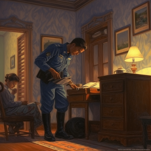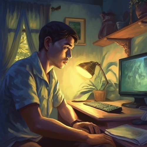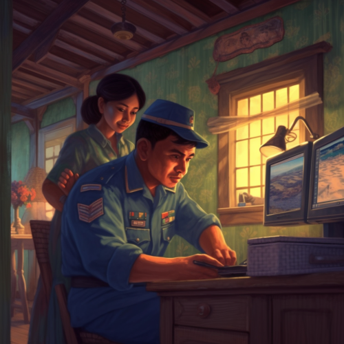 Filipino police officer secretly watching a Filipino using a computer in their bedroom, evening, painting in the style of Amorsolo, 8k detail --s 250 --v 5.0