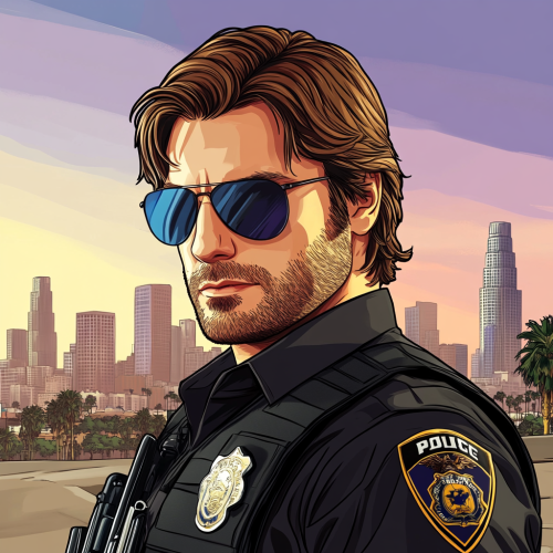 a young caucasian man, brunette hair and brunette beard, hair in a side parting, wearing a black typical US police uniform with a black bulletproof vest, wearing blue aviator glasses, brown eyes. LA skyline behind him, GTA V cartoon style