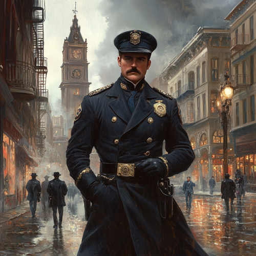 A police officer in San Francisco in 1870 would present a distinctive appearance that reflected the fashion of the time. Physically, he might be of average height, with a robust build, showcasing the strength needed for his job. His face could be marked by the hardships of street work, with a square jaw and a determined gaze. In terms of clothing, the uniform would consist of a dark wool jacket, fitted to the body, with shiny metal buttons and a high collar. He would wear matching trousers, slightly loose, which would fit into black leather boots. A wide-brimmed hat, typical of the era, would complete his outfit, providing protection from the sun. Additionally, he might sport a badge on his chest identifying him as a law officer. For nights or adverse weather conditions, he could have a long wool coat, which would lend an air of authority and respect. This ensemble would not only make him stand out on the streets of San Francisco but also reflect the seriousness and commitment of his duty in a growing city full of challenges.