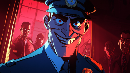 Create a chilling cartoon-style illustration of a police officer, Agent Crane, with a charismatic smile that hides a dark secret. He should be surrounded by shadows, with citizens oblivious to his true nature, confiding in him. The officer's eyes should gleam with a sinister intelligence, suggesting he knows their darkest secrets. In the background, include an array of police badges, crime scene tape, and a hint of chaos, symbolizing the crimes he orchestrates. Use a color palette of dark blues and deep reds to create a foreboding atmosphere. Add subtle details, like a reflection in a window that shows a darker version of himself, enhancing the sense of deception. The overall image should evoke a feeling of unease, making viewers question the nature of trust and the hidden darkness within. --ar 16:9