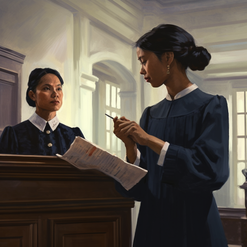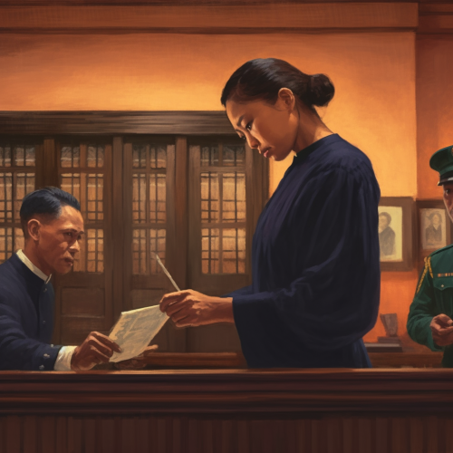 Filipino judge wearing black robes handing search warrant to Filipino police officer, courtroom background, painting in the style of Amorsolo, 8k detail --s 250 --v 5.0
