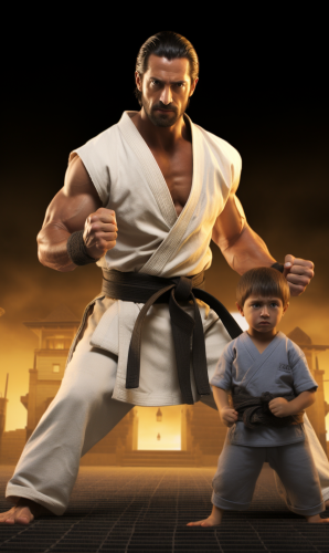 create an ultrarealistic poster for a Hollywood film. A 38 year old Italian athletic man, short bearded, 80kg, 178cm tall, dressed with tactical equipment. There is another version of the same person wearing a karategi, and an italian 10yo kid playing with lego bricks. The background contains the city of Tropea at night.The atmosphere is dark and dramatic. --ar 3:5 --no text v 5.1 --chaos 50
