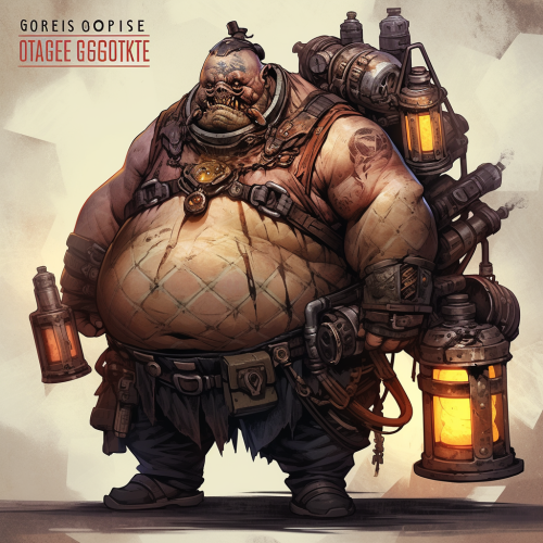 Dieselpunk post-apocalyptic exotic overweight badass wasteland ogre merchant trading goods, anime style, high fantasy, digital art, masterpiece painting, ultra detailed, ultra high definition, 8K resolution, 3D shading, superior quality, cover illustration, complex design, luminous highlights, rich colours, hyperrealistic, meticulously hyper detailed, high contrast, artstation --niji 5