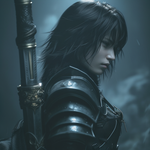 final fantasy woman with a masculine appearance, closed face with mid-length black hair, she is dressed in armor and a large sword on her back, she is in profile, character design, background dark, 8k, 300 dpi, HD, --v 6.0