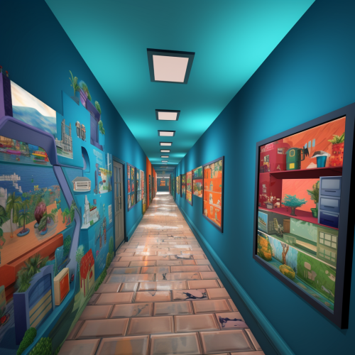 An 8K photo 3:2 showing an isle in the metaverse with rooms diverting from it with school kids going along the isle into different rooms, the rooms representing different professions
