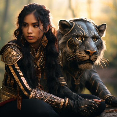 20 years old young Filipino woman with streaks of makeup on her cheekbones, indigenous clothes, crouching next to a panther with golden details on the head, forest in the background, game style, d&d