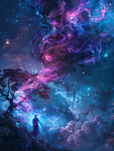 a forest spirit summoning fire, talking to a smoke spirit, made of constellations and faceted opals, iridescent, lustrous, sparking, wonder, in the liquid galaxy, dark blue and purple with magenta accents --style raw --ar 3:4 --v 6.0