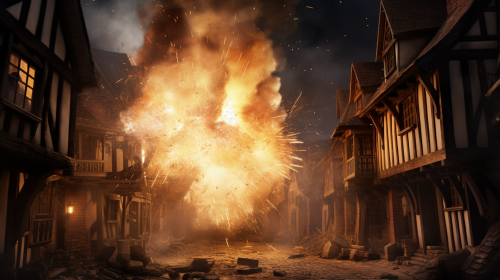 photorealistic movie still of an explosion blasting out of the fourth storey of a medieval building on a medieval street at night, Tudor architecture, UHD 4K, ultrarealism, dynamic lighting, photorealism --ar 16:9 --v 5.2