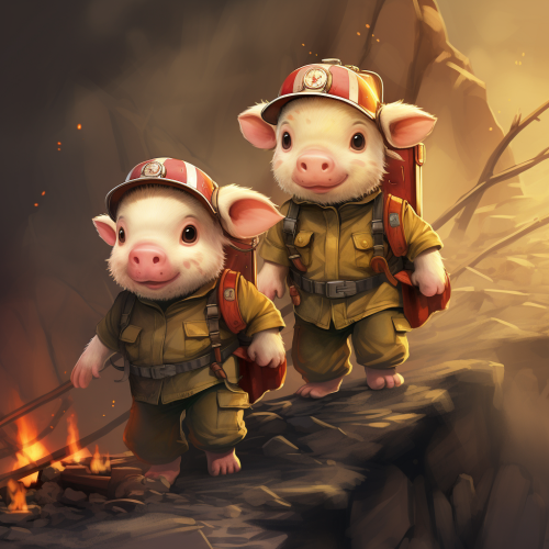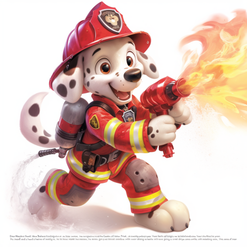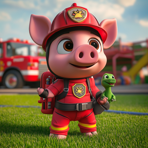 A cute, cartoon-style pig character designed in the style of PAW Patrol, wearing a red fire-rescue uniform with a matching fire helmet. The uniform includes a fire badge on the chest and a small red backpack with rescue tools and has a green dinosaur toy with him. The pig has an eager expression with big, bright eyes and a cheerful smile. The character stands confidently in a playful, action-ready pose, with front legs stretched forward and back legs braced on a grassy area, with a bright fire station yard in the background, complete with a fire truck and training course, adding a high-energy, heroic vibe --v 6.1