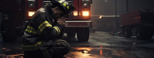 a city firefighter praying at the scene of a building fire that has just been extinguished fire trucks and ambluance are on scene, --ar 8:3 --v 5.2 --s 50