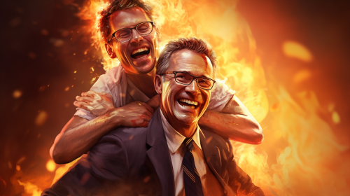 Firefighter man on fire appears with bespectacled businessman on his back, illustrative style, caricature --ar 16:9 --v 5.2 --s 250