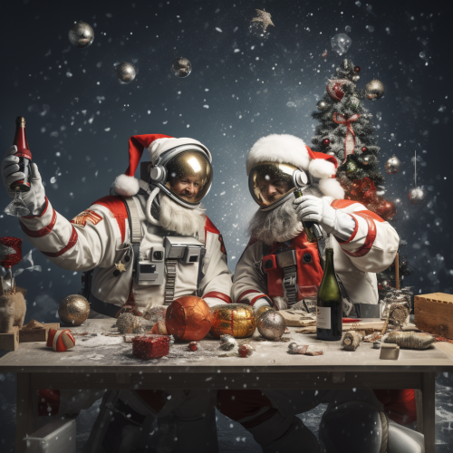 Hyperrealistic photo of two Astronauts celebrating christmas