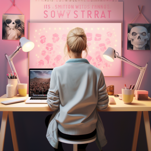 digital art style. facing away from us, woman with blonde messy bun, hoodie with "Finding Stardust" typography on back, sitting at a desk. computer monitor on desk, tablet on desk, drone on desk. Pictures on wall of girly skulls, glitter pattern on wall. pink bag hanging up.