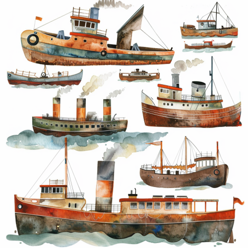 clipart set, evenly spaced, white background, watercolor, steam boats