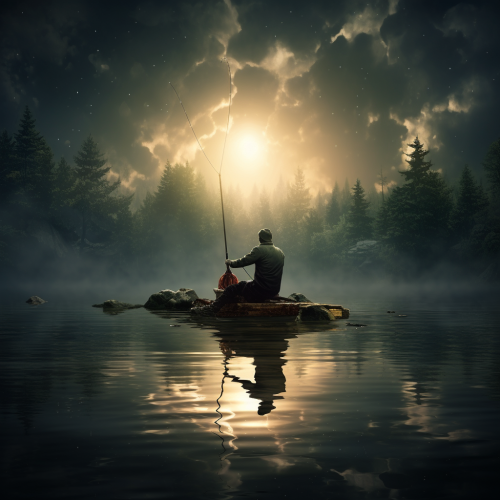 A black and white vector style image of a man standing with a fishing poll in his hands dangling a fish on the end of the line, in the style of cricut SVG cut files, white background, bold and thick. fillind in black outline, simple image, mid shot --v 5.2