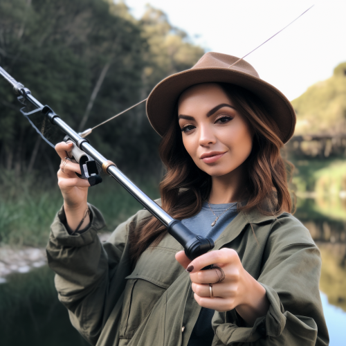 a trad wife influencer presenting a fishing rod. Pov of insta selfie Video, she looks frontal into the cam, raw, very realistic, pic should not Look like ai but a realistic iPhone Video. --v 5.0