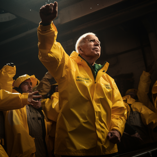 Joe Biden, as the captain of a commercial fishing vessel. He is wearing rain gear, all yellow, and pointing up into the storm as other people haul in a big fish. Photo realistic.