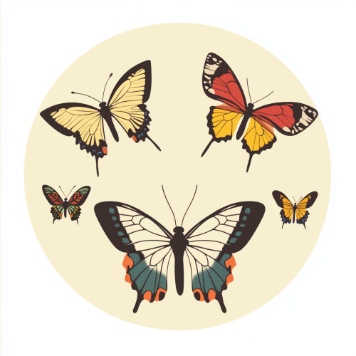 illustrative icons for the Natural History Museum of Los Angeles butterfly pavillon. abstracted in their simplest form. simplified. in a circle, they have to be simple icons, like for an app. natural colors that evoke both organic and the urban nature of Los Angeles. make many different ones. use line.