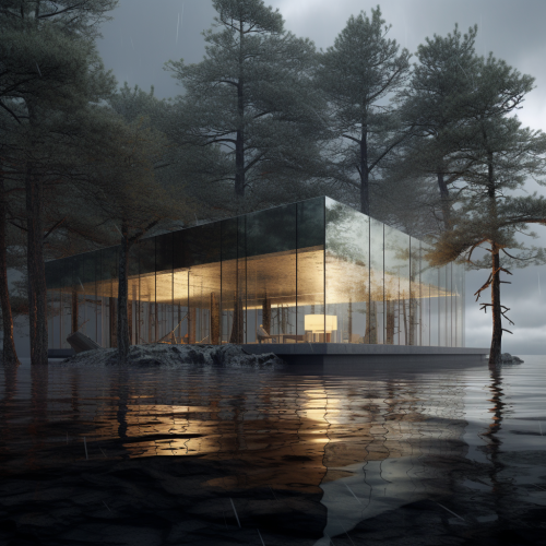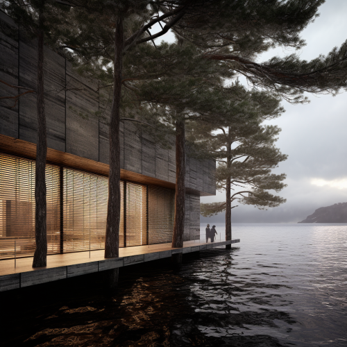 ndustrial timber architecture pavillion, architecture render, norway nature ocean. storm trees rain dramatic enviroment, peter zumthor