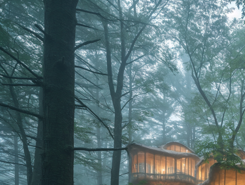 beautiful enlightened poetic realistic art pavillion that looks like a laboratory in wood, glass, mycelium and futuristic materials by kengo kuma and mad architects suspended in the trees in the foggy forrest of japan, mystic atmosphere, --ar 4:3 --v 6.0 --s 550