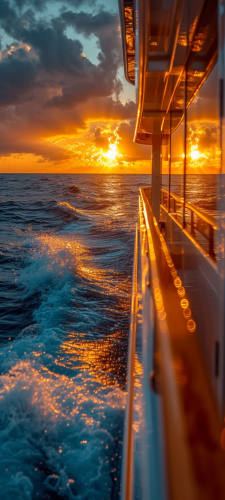 realistic photo from inside of a luxury yacht looking out over the shimmering ocean with the california coastline in the distance on a beautiful sunny day with golden sunlight with the focal point at the center of the photo at 24mm, 50 megapixels, DPI 300, --ar 9:20 --s 750 --v 6.0 --style raw