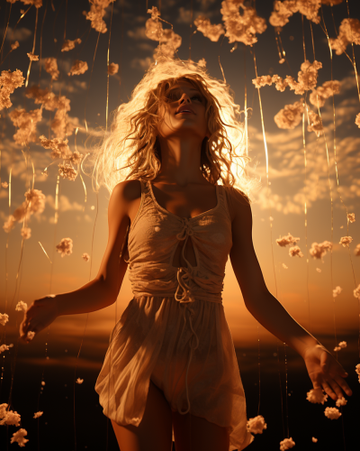 1970s woman splashing water, at the beach playing with a voleyball, golden hour, surreal --s 1000 --chaos 50 --ar 4:5