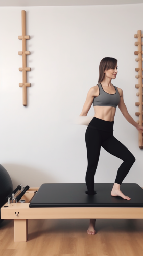 pilates room, on the wall there are arc shape mirrors, parquet flooring, invisible lights behind the mirrors, spot lights on the ceiling, rectangle room with a window, cadillac pilates bar in the room, --ar 3:4