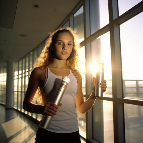young teen girl holding a Tube for effervescent tablets into the camera, in a high end fitness studio, sunlight coming from a big window, perfect framing, wide shot, natural lighting, f1/8, global illumination, shot on kodak gold 200, film grain, accent lightning --s 50