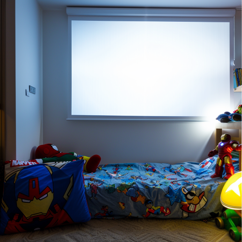 realistic photo of a brightly lit child's bedroom shot on a Canon 1D. the child is a marvel fan. blank flat wall with empty space at the back --v 6.0 --no poster