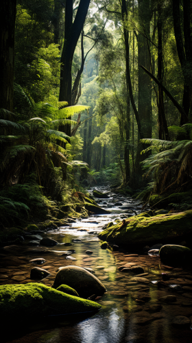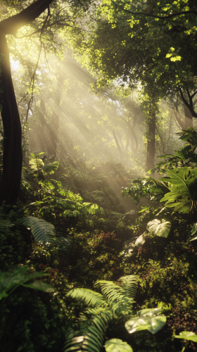 [c9d923b9c] A dense, lush forest with towering ancient trees, vibrant undergrowth, and a rich diversity of flora and fauna. Sunlight filters through the thick canopy, casting dappled patterns on the forest floor. The air is filled with the earthy scent of damp soil and the sweet fragrance of blooming flowers. Small streams meander through the underbrush, creating pockets of serene, reflective water. Birds of all colors flit and chirp among the branches, while elusive woodland creatures peek out from behind fern-covered rocks. The forest seems to be alive with energy and mystery, inviting exploration and discovery at every turn. Deep within this enchanted woodland, the secrets of nature await to be unveiled. A dense, lush forest. Lush, vibrant, diverse, mysterious, lively. DSLR. Wide angle lens. Early morning. Surrealistic landscape. Color negative film. --v 5.2 --ar 9:16 --c 0