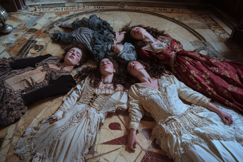 5 women wearing victorian clothes lay on a large kitchen floor that has a giant heart print on the tiles, one cries as they lay on their sides with their heads touching in a star shape --ar 3:2