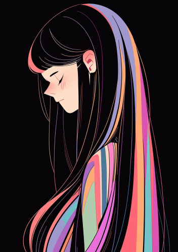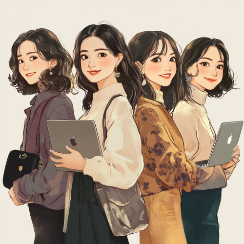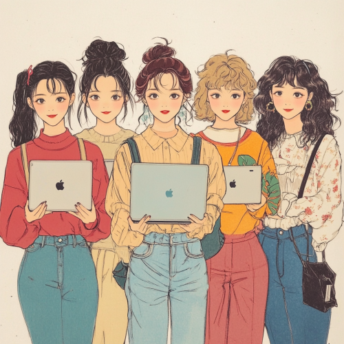 Please illustrate five simple 30-year-old Japanese women. All of them should be holding a Mac computer and smiling. The hair should be carefully drawn with a glossy look, using a modern, millennial-inspired style and color palette. The illustrations should have a retro touch reminiscent of 1980s–1990s Japan