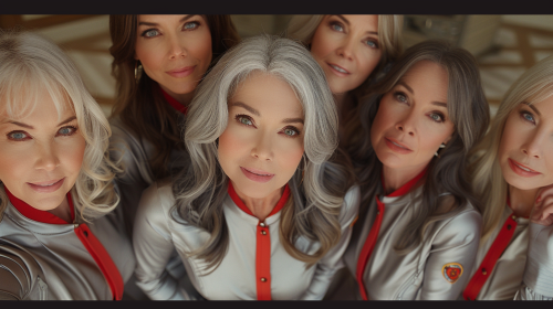 close realistic photo low angle shot looking up, all looking at camera, chorus line of fully body shot facing same direction, six Caucusian brunette middle age women, beautiful gray hair, smiling, 56 years old, wearing two piece rubber suits, high heels, hotel suite background, Canon 5D Mark IV, 8k --ar 16:9 --s 750