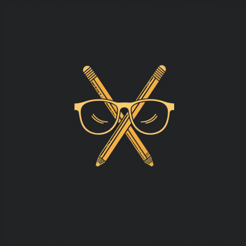 create logo for artist that includes eyeglasses and the crossed pencils, flat, 2d, minimal, modern