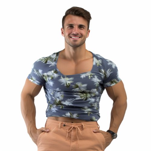 very realistic photo, 4k, white flat background png-file, fit guy dressed in summer attire, showing his abs, has attitude but is friendly looking, 25 years old.