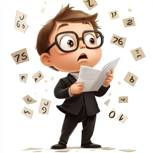 illustration of cute kid in a suit with specs...holding and paper lookind at finance and acting confused , white background, zoomed, words floating around him