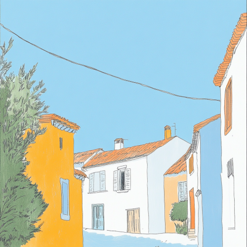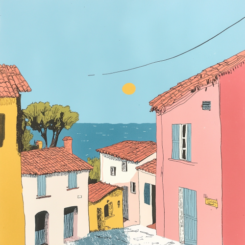 risograph print texture, provencal village south france, line drawing, minimalist, harriet lee-merrion, colorful , very blue sky , sunny day , summer day ,