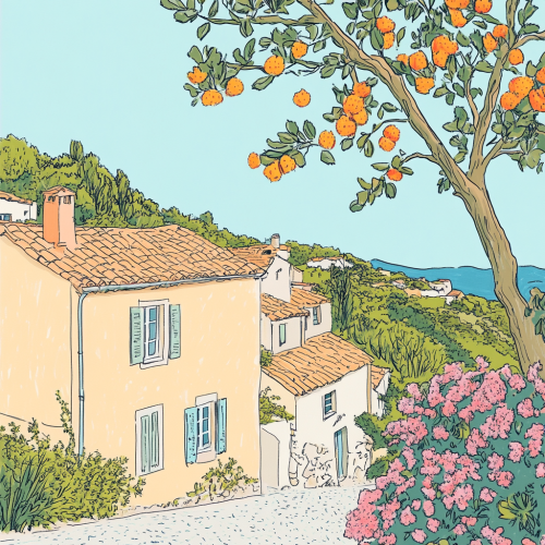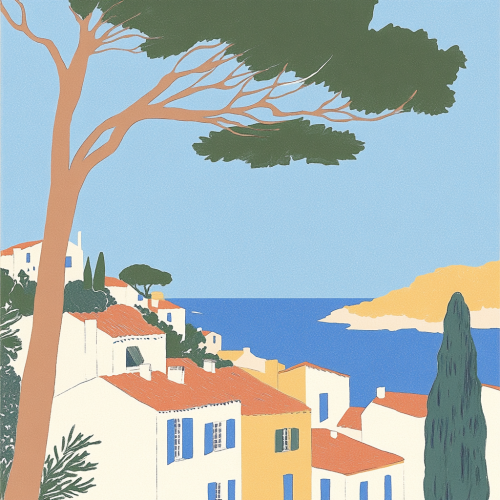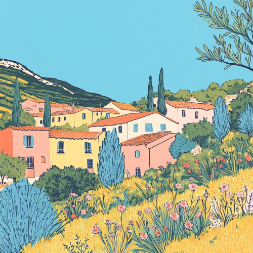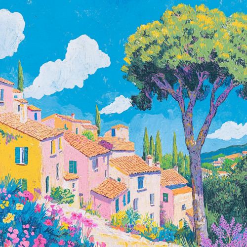 risograph print texture, provencal village south france, very colorful , very blue sky , sunny day , summer day , provencal nature , tree , flowers , small montagne